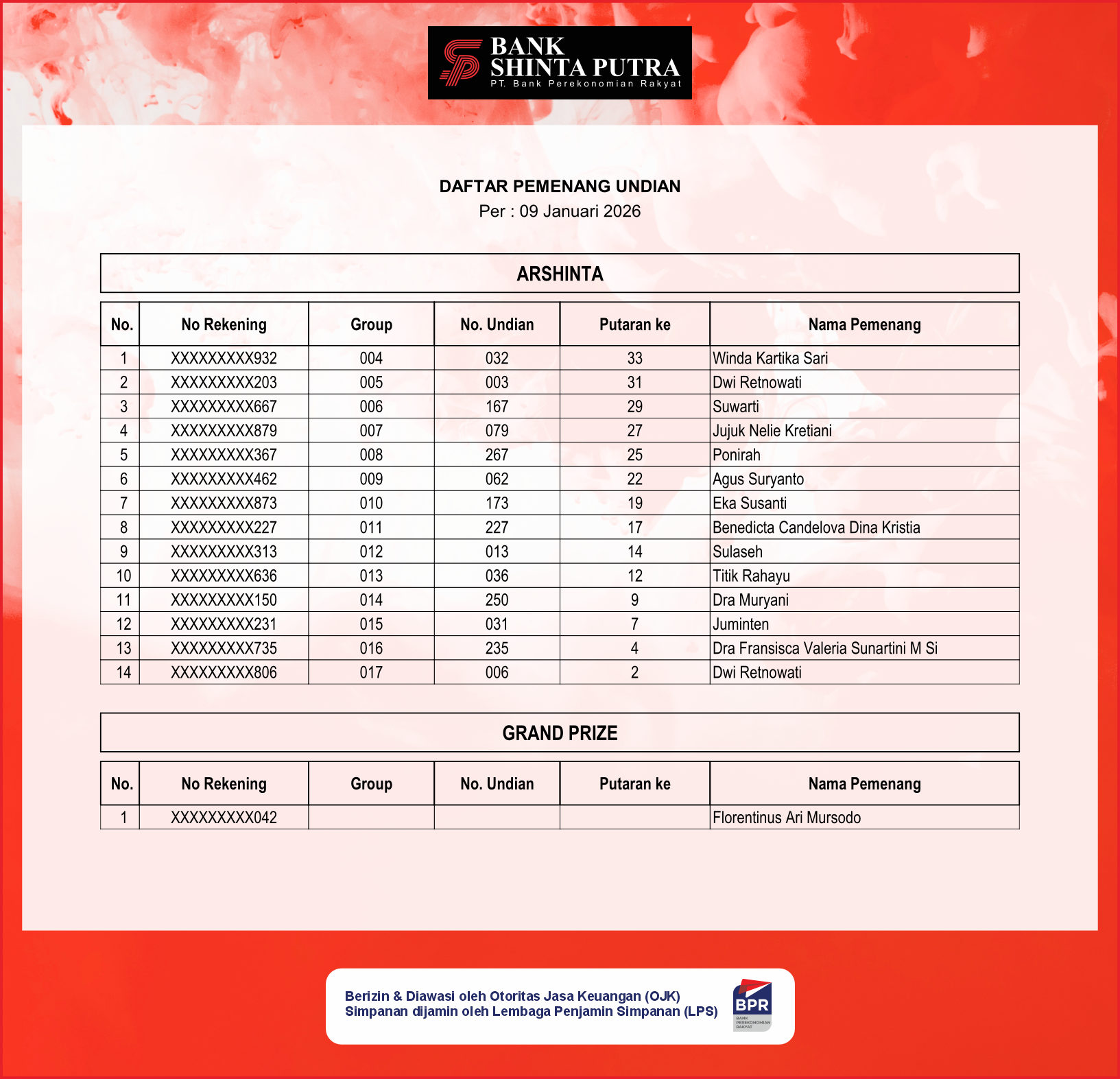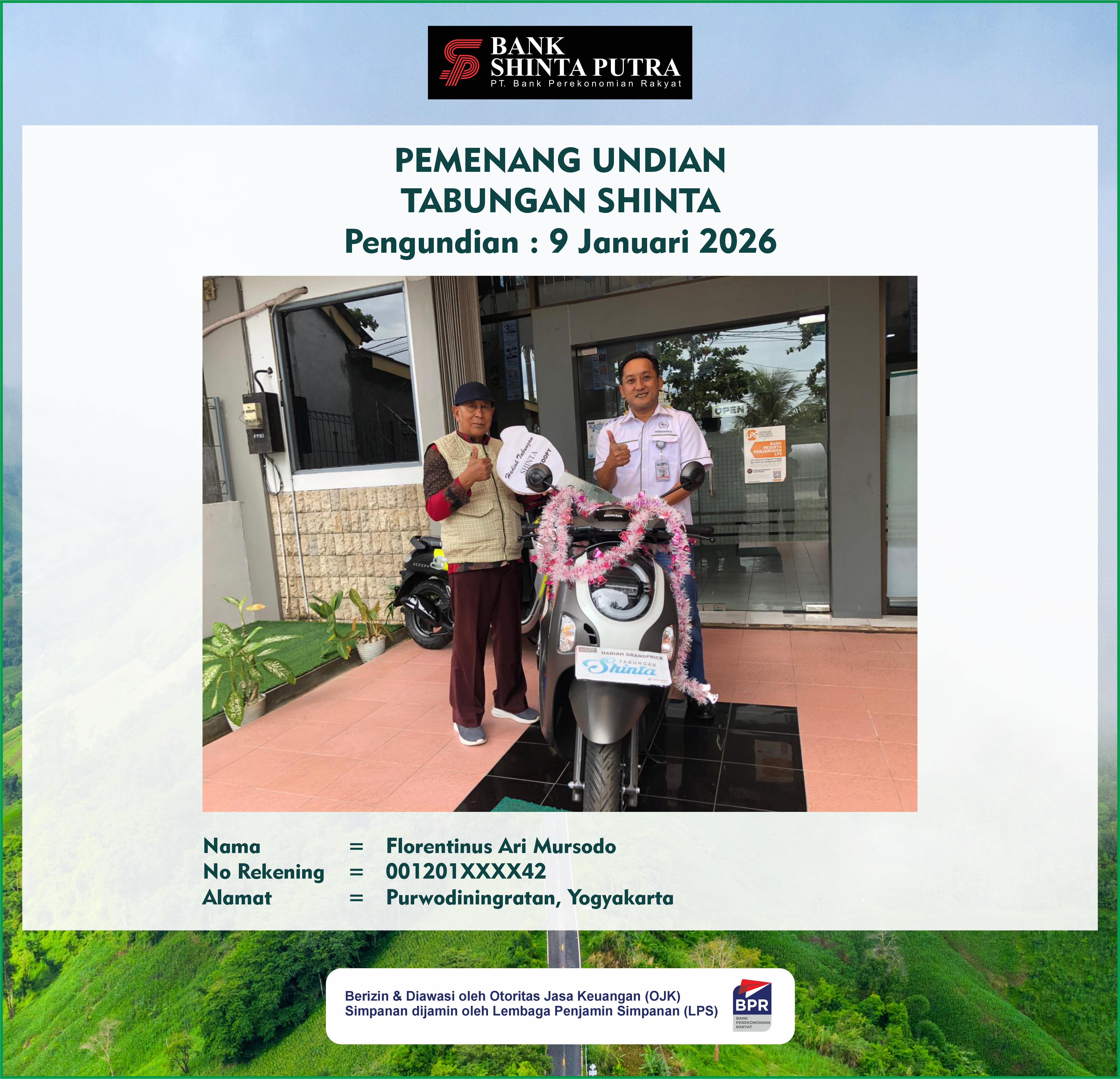 Pemenang Grandprize Undian Tabungan Shinta Selamat kepada Bapak Frorentinus Ari Mursodo Alamat Purwodiningratan, Yogyakarta .